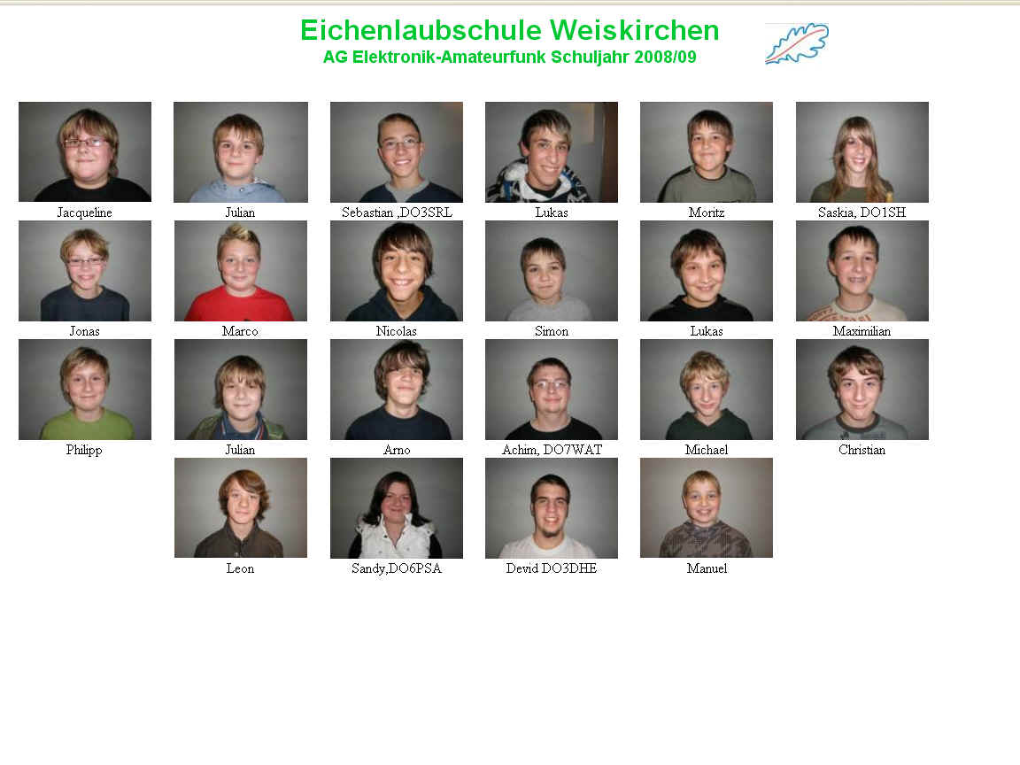 - Unterstützt werde ich durch ehemalige Teilnehmer (Devid DM3DH; Sebastian DO3SRL; Achim DO7WAT ), die ihr erworbenes Wissen an die Gruppe weitergeben, Bernd DG6VC betreut die jüngsten Teilnehmer im praktischen Teil , sowie den Schulleiter Günter Peifer, DO9GPF und Dr. Thomas Georg (Mathematik und Physik)